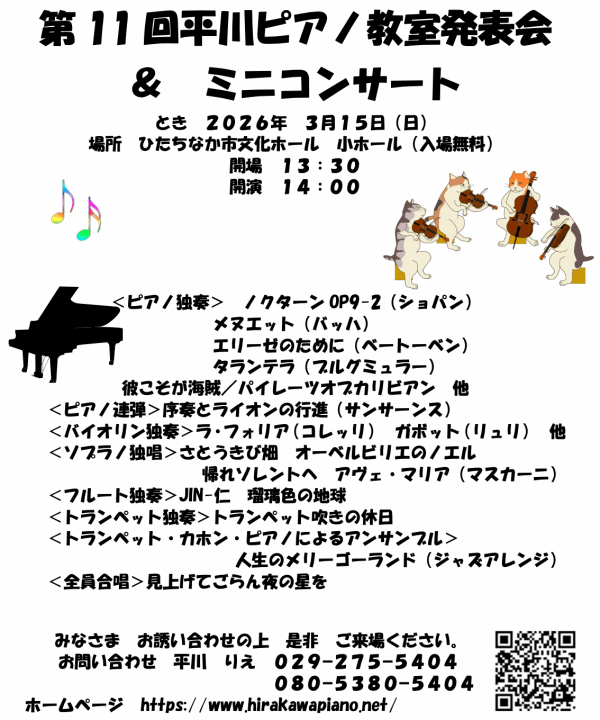 第10回平川ピアノ教室発表会 & ミニコンサートの概要と演奏曲目が決まりました。
